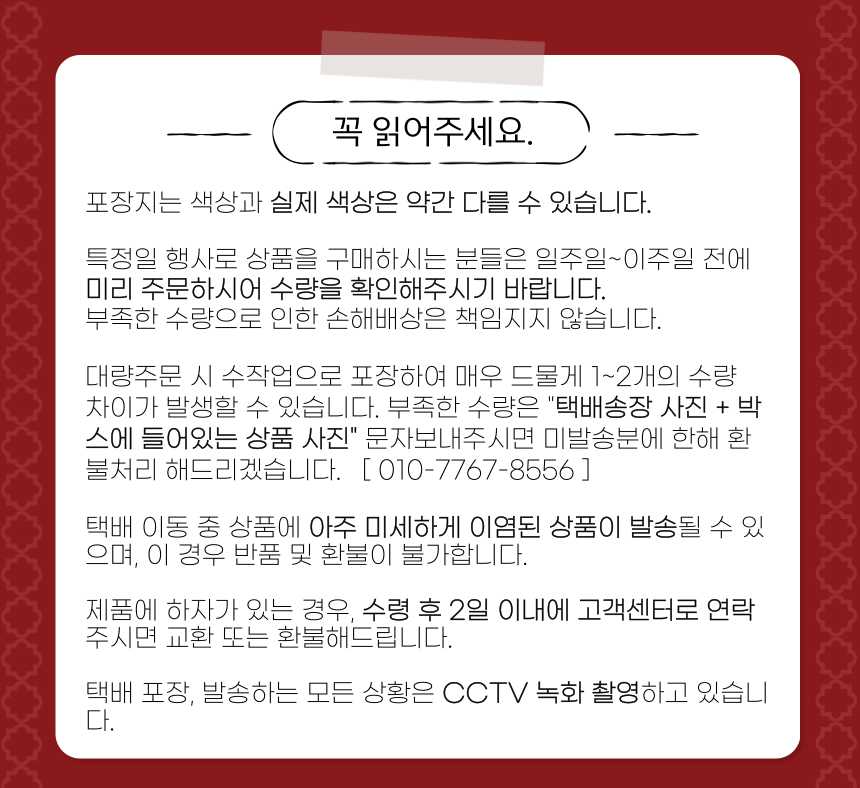 5. 단순변심에 의한 교환/반품시 왕복 택배비는 구매자가 부담하셔야 합니다.