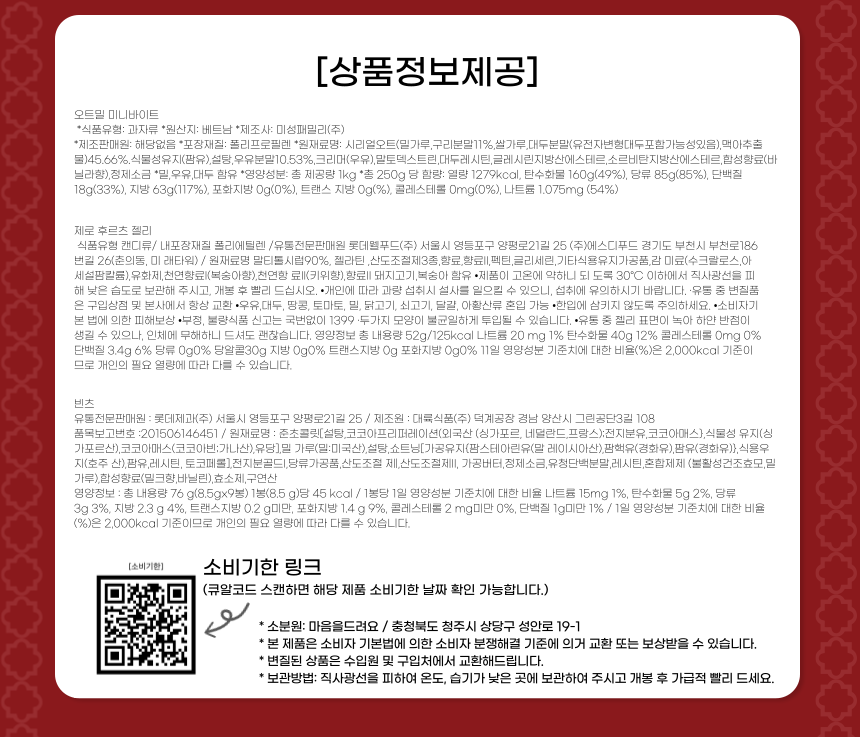 | 제조연월일, 유통기한 또는 품질유지기한 | 상품상세 _큐알코드참조 |