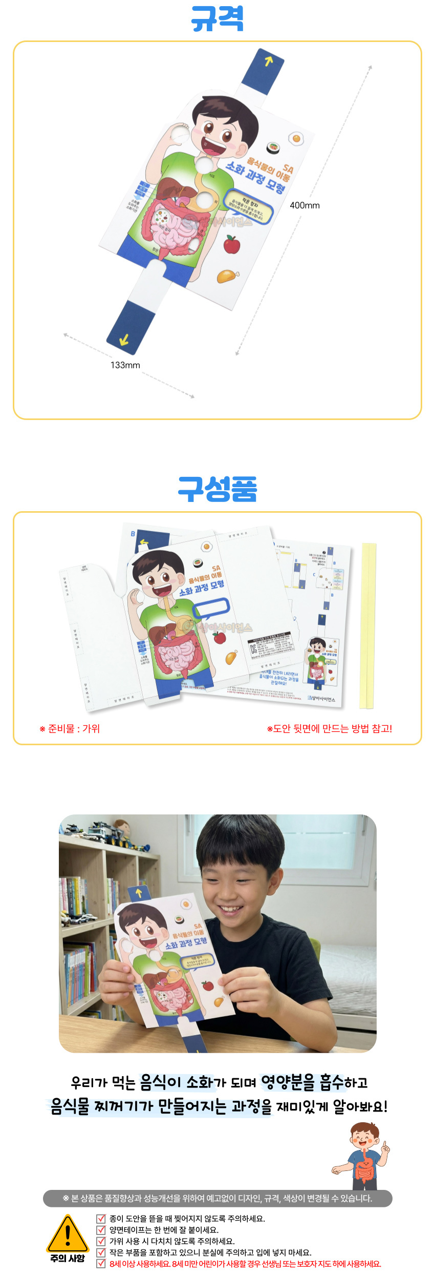 | 취급방법 및 취급시 주의사항, 안전표시 | 8세 미만의 어린이가 사용할 경우 선생님 또는 보호자 지도 하에 사용하세요. |